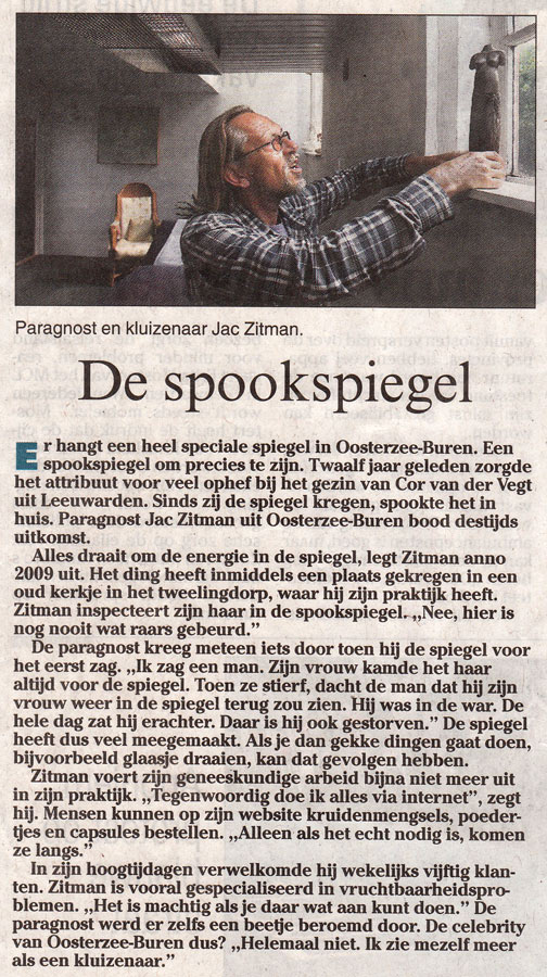 Op verzoek van Omroep Friesland heb ik de spiegel uit Buitenpost naar mijn huis gehaald, en daar zal hij wel blijven ook want niemand van de familie van Cor wil de spiegel in zijn huis hebben, en dat is maar goed ook want waarom zou je leven met een spiegel waar je bang voor ben.
