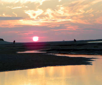 In de vuurrode zon die wegzakt aan de verre horizon,